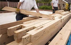 Upon completion, oak trusses arrive in kit form on a lorry ready for assembly. Each section has clear coding to ensure easy construction by a builder.
